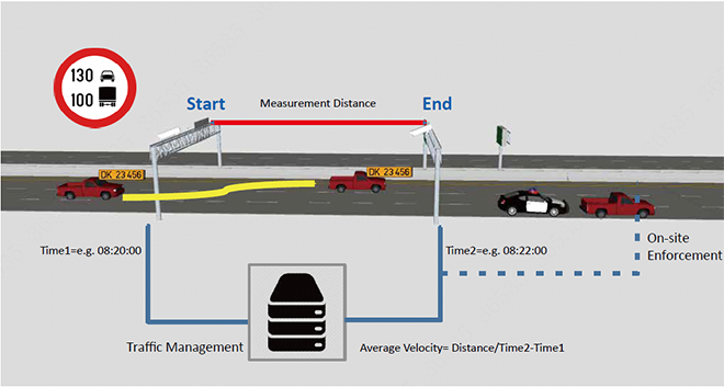 The Dahua ANPR camera captures the plate number and time at both the section start and end, and forwards this information to the platform. The platform then evaluates the average velocity of each passing vehicle. The margin of error of velocity detection diminishes as section length increases. The recommended distance of sections is 2-5km, of which accuracy reaches up to 99.8%. Multiple velocity limits can also be set for different types of vehicles.
