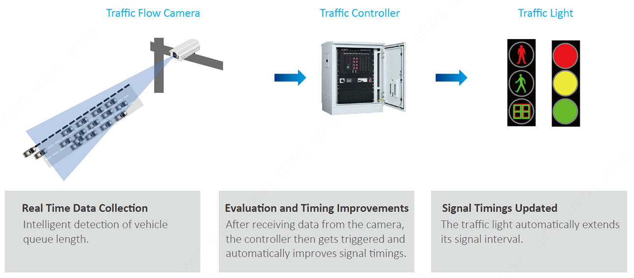 The traffic flow camera detects vehicles in pre-defined lanes and sends the length of vehicle queues to the controller through an Ethernet connection. The controller then triggers and automatically improves signal timings.