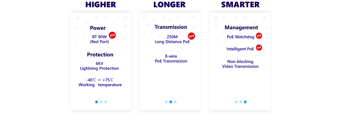 PoE 2.0 is specially designed for surveillance transmission. At present, the entire Dahua PoE switch series is fully upgraded to PoE2.0 that includes practical features such as PoE Watchdog, BT 90W (Red Port) and Long Distance PoE Transmission. These functions significantly enhance the utility of our switches in surveillance scenarios, making them more convenient to maintain.