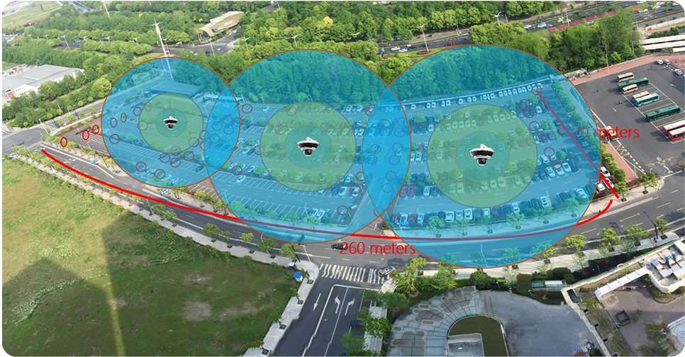 For a 260 x 70 meters parking lot , 3*Panoramic=60 IP cameras