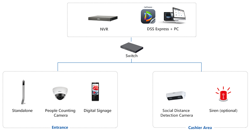 This solution offers temperature monitoring, people flow control and social distancing reminder, which