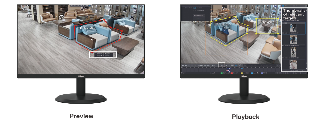 AcuPick 2.0 supports pre-search by intrusion and tripwire. With AcuPick, users can draw an irregular intrusion rule or tripwire to search for video clips in the preview and playback page, helping users to quickly and easily identify the target that entered the area. Users can click on the thumbnails to quickly lock the target and activate AcuPick.